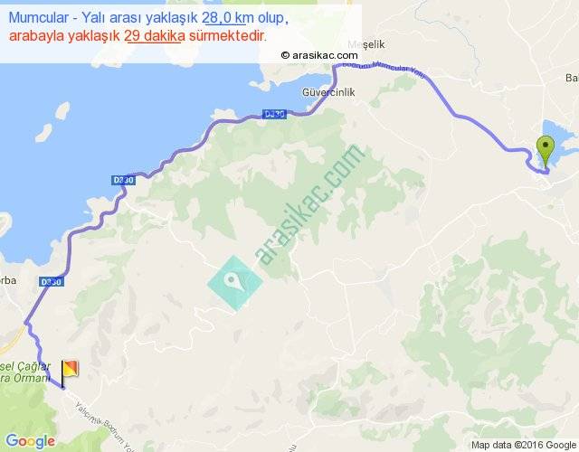 Mumcular - Yalı arası yaklaşık olarak 90 km/h ile yukarıda belirtilen sürede olup, iki yerin kuş uçuşu uzaklığı (mesafesi) 18'dir. Yolculuk otobüsle 37 dakika sürmektedir.