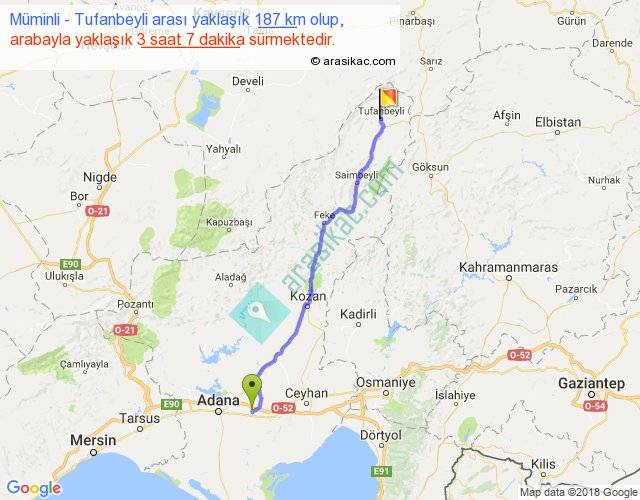 Müminli - Tufanbeyli arası yaklaşık olarak 90 km/h ile yukarıda belirtilen sürede olup, iki yerin kuş uçuşu uzaklığı (mesafesi) 153'dir. Yolculuk otobüsle 4 saat 3 dakika sürmektedir.