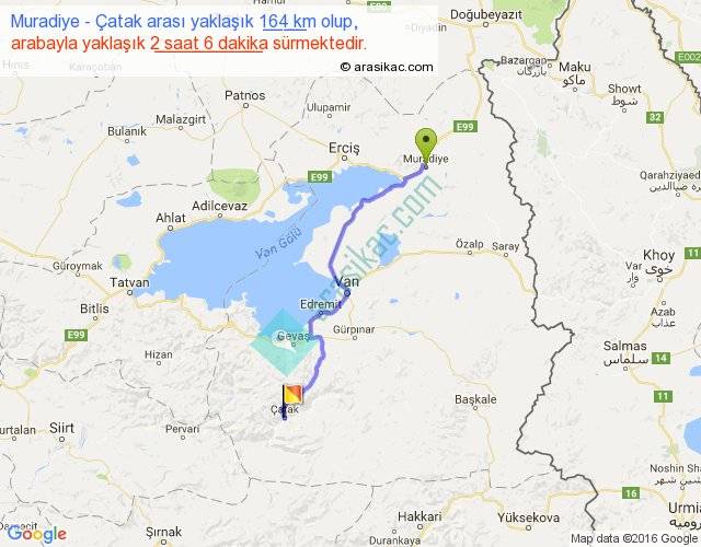 Muradiye - Çatak arası yaklaşık olarak 90 km/h ile yukarıda belirtilen sürede olup, iki yerin kuş uçuşu uzaklığı (mesafesi) 125'dir. Yolculuk otobüsle 2 saat 43 dakika sürmektedir.