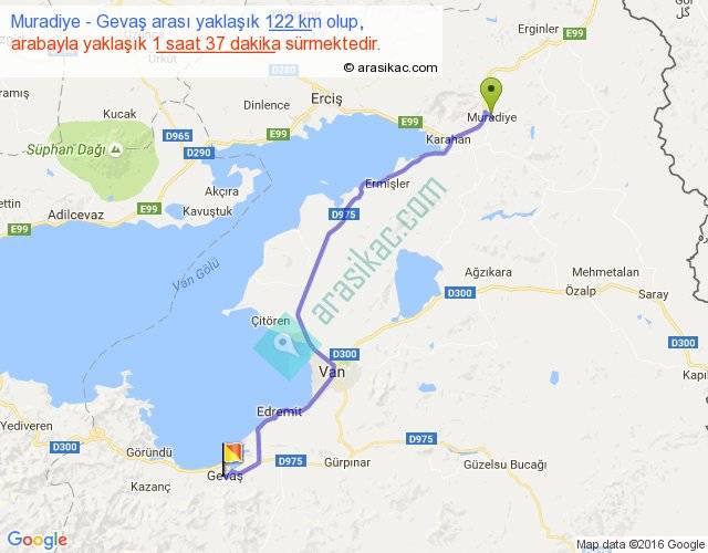 Muradiye - Gevaş arası yaklaşık olarak 90 km/h ile yukarıda belirtilen sürede olup, iki yerin kuş uçuşu uzaklığı (mesafesi) 96'dir. Yolculuk otobüsle 2 saat 6 dakika sürmektedir.