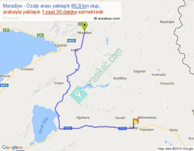 Muradiye - Özalp arası yaklaşık olarak 90 km/h ile yukarıda belirtilen sürede olup, iki yerin kuş uçuşu uzaklığı (mesafesi) 42'dir. Yolculuk otobüsle 1 saat 57 dakika sürmektedir.