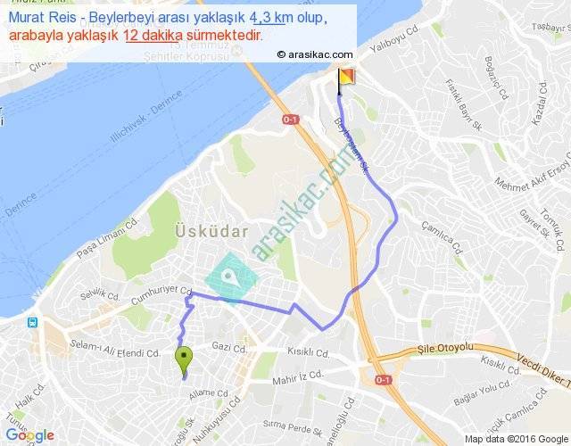 Murat Reis - Beylerbeyi arası yaklaşık olarak 90 km/h ile yukarıda belirtilen sürede olup, iki yerin kuş uçuşu uzaklığı (mesafesi) 3'dir. Yolculuk otobüsle 15 dakika sürmektedir.