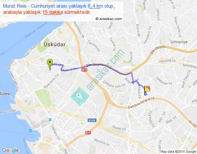 Murat Reis - Cumhuriyet arası yaklaşık olarak 90 km/h ile yukarıda belirtilen sürede olup, iki yerin kuş uçuşu uzaklığı (mesafesi) 5'dir. Yolculuk otobüsle 19 dakika sürmektedir.