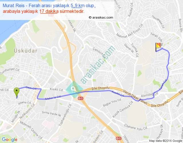 Murat Reis - Ferah arası yaklaşık olarak 90 km/h ile yukarıda belirtilen sürede olup, iki yerin kuş uçuşu uzaklığı (mesafesi) 4'dir. Yolculuk otobüsle 22 dakika sürmektedir.