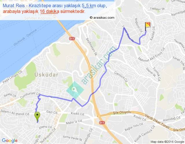 Murat Reis - Kirazlıtepe arası yaklaşık olarak 90 km/h ile yukarıda belirtilen sürede olup, iki yerin kuş uçuşu uzaklığı (mesafesi) 4'dir. Yolculuk otobüsle 20 dakika sürmektedir.
