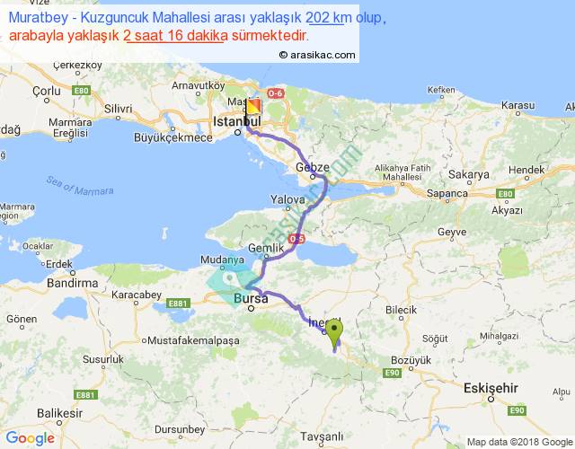 Muratbey - Kuzguncuk Mahallesi arası yaklaşık olarak 90 km/h ile yukarıda belirtilen sürede olup, iki yerin kuş uçuşu uzaklığı (mesafesi) 124'dir. Yolculuk otobüsle 2 saat 56 dakika sürmektedir.