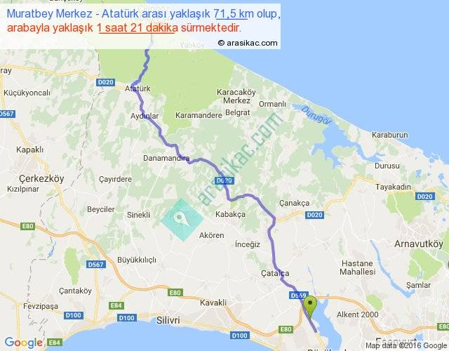 Muratbey Merkez - Atatürk arası yaklaşık olarak 90 km/h ile yukarıda belirtilen sürede olup, iki yerin kuş uçuşu uzaklığı (mesafesi) 52'dir. Yolculuk otobüsle 1 saat 45 dakika sürmektedir.