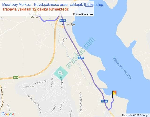 Muratbey Merkez - Büyükçekmece arası yaklaşık olarak 90 km/h ile yukarıda belirtilen sürede olup, iki yerin kuş uçuşu uzaklığı (mesafesi) 7'dir. Yolculuk otobüsle 15 dakika sürmektedir.