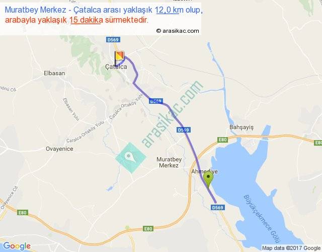 Muratbey Merkez - Çatalca arası yaklaşık olarak 90 km/h ile yukarıda belirtilen sürede olup, iki yerin kuş uçuşu uzaklığı (mesafesi) 9'dir. Yolculuk otobüsle 19 dakika sürmektedir.