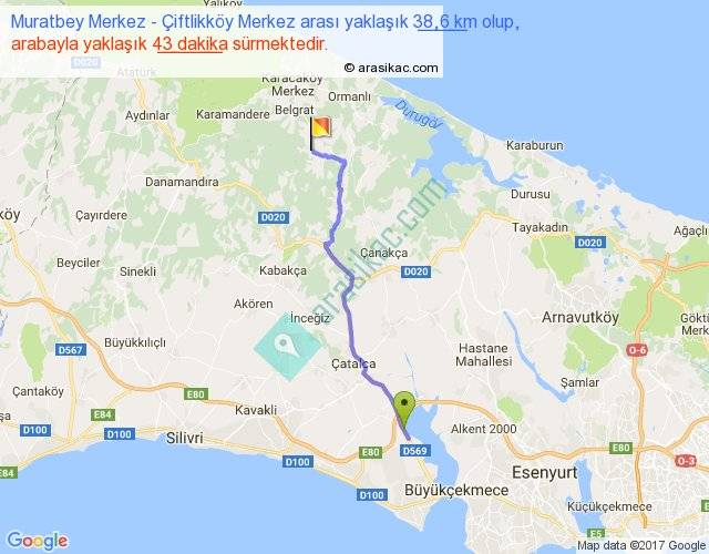 Muratbey Merkez - Çiftlikköy Merkez arası yaklaşık olarak 90 km/h ile yukarıda belirtilen sürede olup, iki yerin kuş uçuşu uzaklığı (mesafesi) 30'dir. Yolculuk otobüsle 55 dakika sürmektedir.