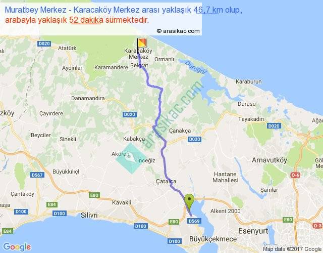 Muratbey Merkez - Karacaköy Merkez arası yaklaşık olarak 90 km/h ile yukarıda belirtilen sürede olup, iki yerin kuş uçuşu uzaklığı (mesafesi) 38'dir. Yolculuk otobüsle 1 saat 7 dakika sürmektedir.