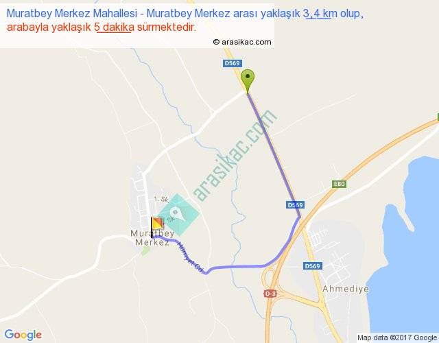 Muratbey Merkez Mahallesi - Muratbey Merkez arası yaklaşık olarak 90 km/h ile yukarıda belirtilen sürede olup, iki yerin kuş uçuşu uzaklığı (mesafesi) 2'dir. Yolculuk otobüsle 6 dakika sürmektedir.