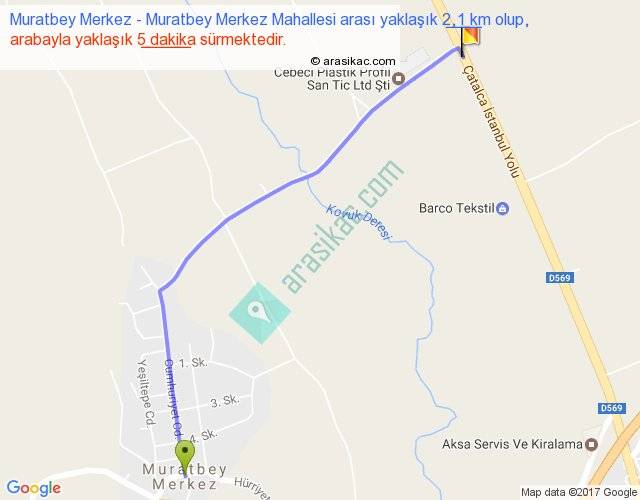 Muratbey Merkez - Muratbey Merkez Mahallesi arası yaklaşık olarak 90 km/h ile yukarıda belirtilen sürede olup, iki yerin kuş uçuşu uzaklığı (mesafesi) 2'dir. Yolculuk otobüsle 6 dakika sürmektedir.