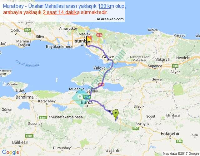 Muratbey - Ünalan Mahallesi arası yaklaşık olarak 90 km/h ile yukarıda belirtilen sürede olup, iki yerin kuş uçuşu uzaklığı (mesafesi) 119'dir. Yolculuk otobüsle 2 saat 54 dakika sürmektedir.