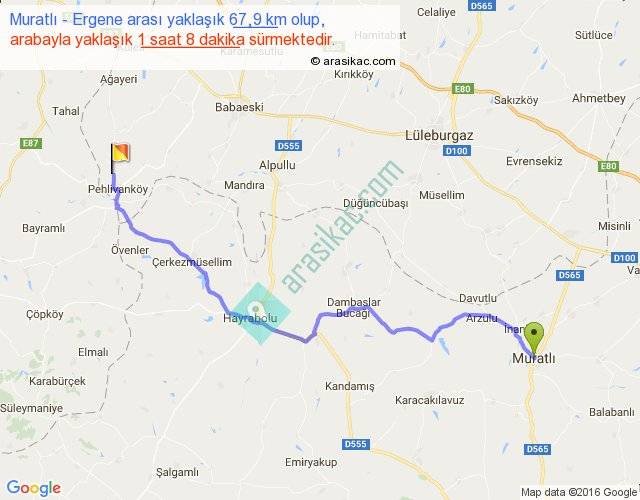 Muratlı - Ergene arası yaklaşık olarak 90 km/h ile yukarıda belirtilen sürede olup, iki yerin kuş uçuşu uzaklığı (mesafesi) 52'dir. Yolculuk otobüsle 1 saat 28 dakika sürmektedir.