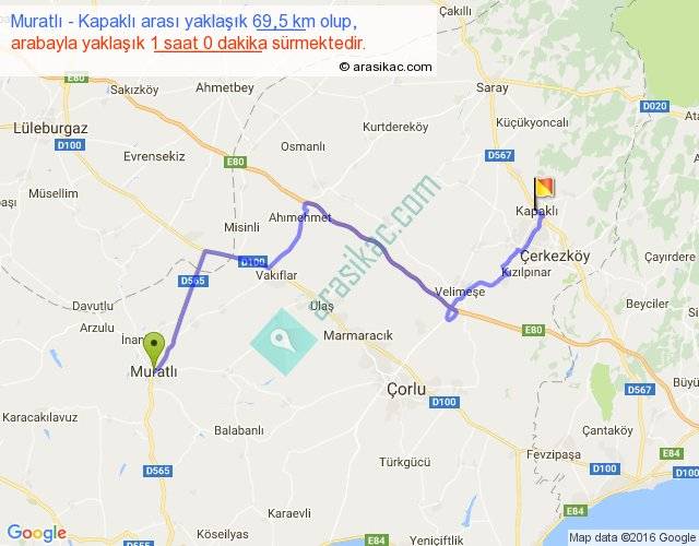 Muratlı - Kapaklı arası yaklaşık olarak 90 km/h ile yukarıda belirtilen sürede olup, iki yerin kuş uçuşu uzaklığı (mesafesi) 43'dir. Yolculuk otobüsle 1 saat 18 dakika sürmektedir.