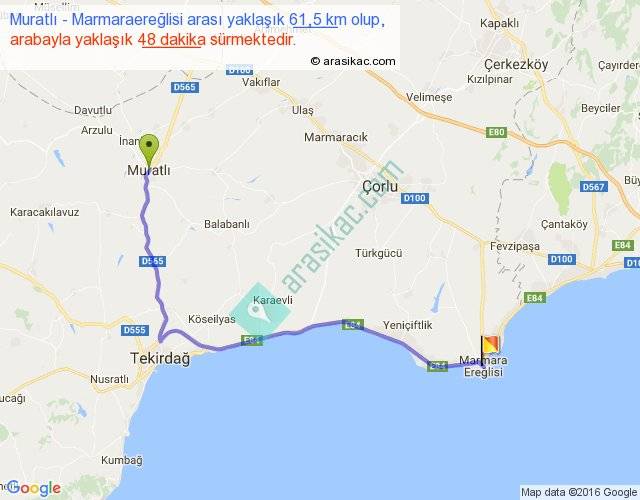 Muratlı - Marmaraereğlisi arası yaklaşık olarak 90 km/h ile yukarıda belirtilen sürede olup, iki yerin kuş uçuşu uzaklığı (mesafesi) 44'dir. Yolculuk otobüsle 1 saat 2 dakika sürmektedir.