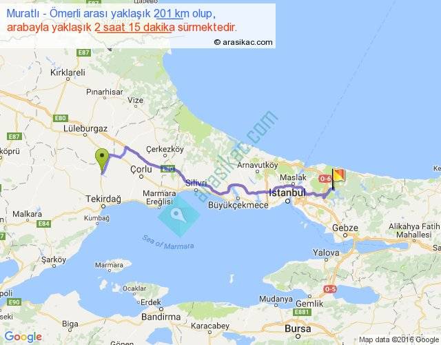 Muratlı - Ömerli arası yaklaşık olarak 90 km/h ile yukarıda belirtilen sürede olup, iki yerin kuş uçuşu uzaklığı (mesafesi) 154'dir. Yolculuk otobüsle 2 saat 55 dakika sürmektedir.
