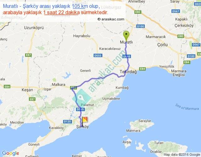 Muratlı - Şarköy arası yaklaşık olarak 90 km/h ile yukarıda belirtilen sürede olup, iki yerin kuş uçuşu uzaklığı (mesafesi) 69'dir. Yolculuk otobüsle 1 saat 46 dakika sürmektedir.