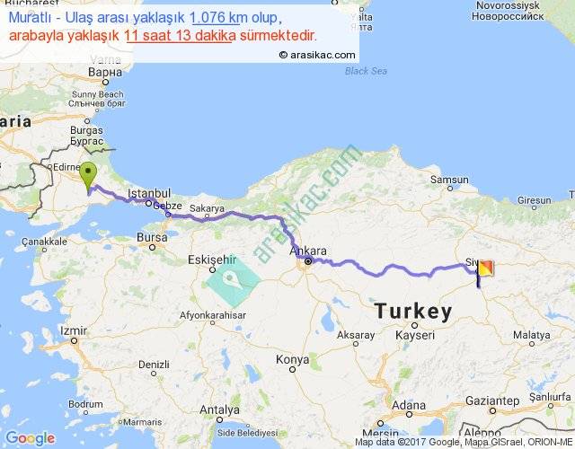 Muratlı - Ulaş arası yaklaşık olarak 90 km/h ile yukarıda belirtilen sürede olup, iki yerin kuş uçuşu uzaklığı (mesafesi) 826'dir. Eğer belirtilen yerler arasında uçak seferi var ise bu süre uçakla 1 saat 16 dakika'ya kadar düşebilir. Yolculuk otobüsle 14 saat 34 dakika sürmektedir.