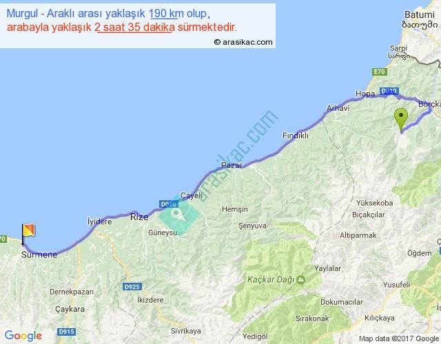 Murgul - Araklı arası yaklaşık olarak 90 km/h ile yukarıda belirtilen sürede olup, iki yerin kuş uçuşu uzaklığı (mesafesi) 131'dir. Yolculuk otobüsle 3 saat 21 dakika sürmektedir.