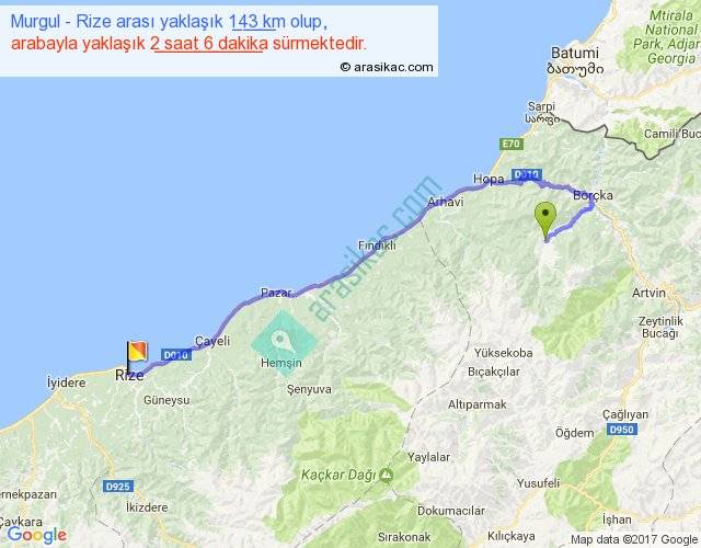 Murgul - Rize arası yaklaşık olarak 90 km/h ile yukarıda belirtilen sürede olup, iki yerin kuş uçuşu uzaklığı (mesafesi) 91'dir. Yolculuk otobüsle 2 saat 43 dakika sürmektedir.