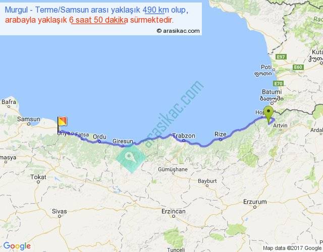 Murgul - Terme Samsun arası yaklaşık olarak 90 km/h ile yukarıda belirtilen sürede olup, iki yerin kuş uçuşu uzaklığı (mesafesi) 381'dir. Eğer belirtilen yerler arasında uçak seferi var ise bu süre uçakla 35 dakika'ya kadar düşebilir. Yolculuk otobüsle 8 saat 53 dakika sürmektedir.