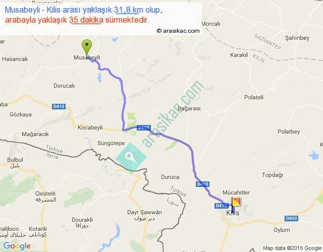 Musabeyli - Kilis arası yaklaşık olarak 90 km/h ile yukarıda belirtilen sürede olup, iki yerin kuş uçuşu uzaklığı (mesafesi) 26'dir. Yolculuk otobüsle 45 dakika sürmektedir.