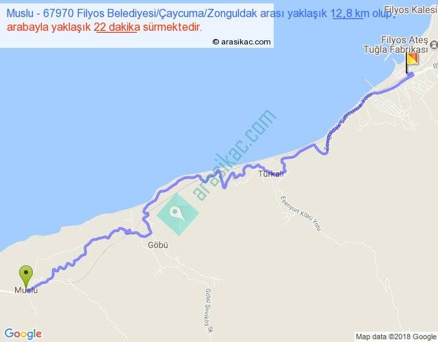 Muslu - 67970 Filyos Belediyesi Çaycuma Zonguldak arası yaklaşık olarak 90 km/h ile yukarıda belirtilen sürede olup, iki yerin kuş uçuşu uzaklığı (mesafesi) 9'dir. Yolculuk otobüsle 28 dakika sürmektedir.