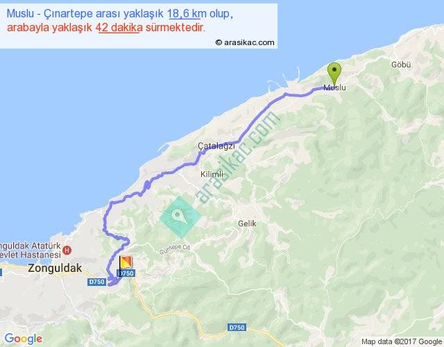Muslu - Çınartepe arası yaklaşık olarak 90 km/h ile yukarıda belirtilen sürede olup, iki yerin kuş uçuşu uzaklığı (mesafesi) 12'dir. Yolculuk otobüsle 54 dakika sürmektedir.
