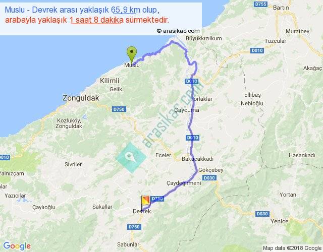Muslu - Devrek arası yaklaşık olarak 90 km/h ile yukarıda belirtilen sürede olup, iki yerin kuş uçuşu uzaklığı (mesafesi) 33'dir. Yolculuk otobüsle 1 saat 28 dakika sürmektedir.
