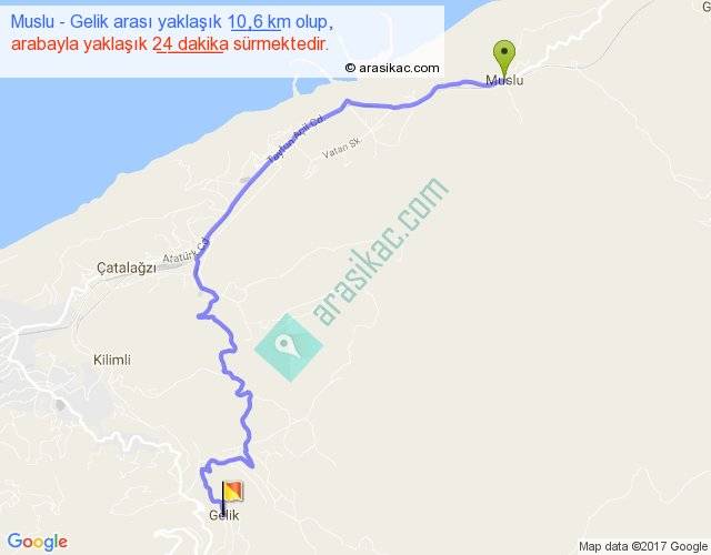 Muslu - Gelik arası yaklaşık olarak 90 km/h ile yukarıda belirtilen sürede olup, iki yerin kuş uçuşu uzaklığı (mesafesi) 7'dir. Yolculuk otobüsle 31 dakika sürmektedir.