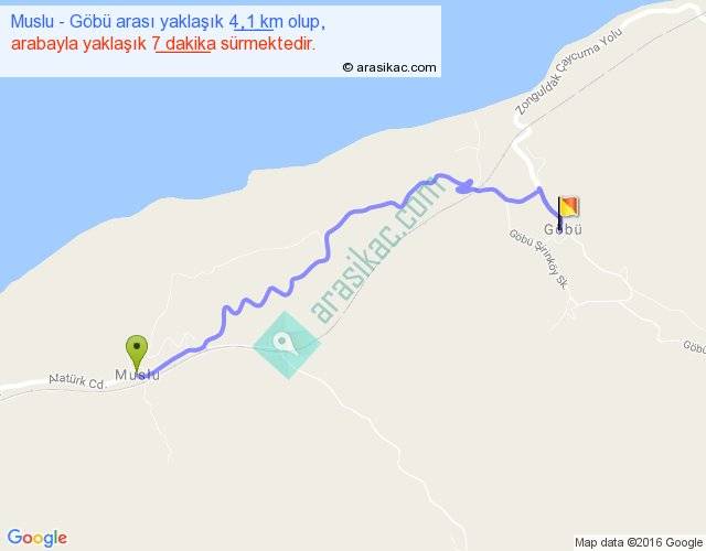 Muslu - Göbü arası yaklaşık olarak 90 km/h ile yukarıda belirtilen sürede olup, iki yerin kuş uçuşu uzaklığı (mesafesi) 3'dir. Yolculuk otobüsle 9 dakika sürmektedir.