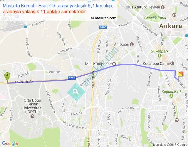 Mustafa Kemal - Esat Cd. arası yaklaşık olarak 90 km/h ile yukarıda belirtilen sürede olup, iki yerin kuş uçuşu uzaklığı (mesafesi) 8'dir. Yolculuk otobüsle 14 dakika sürmektedir.