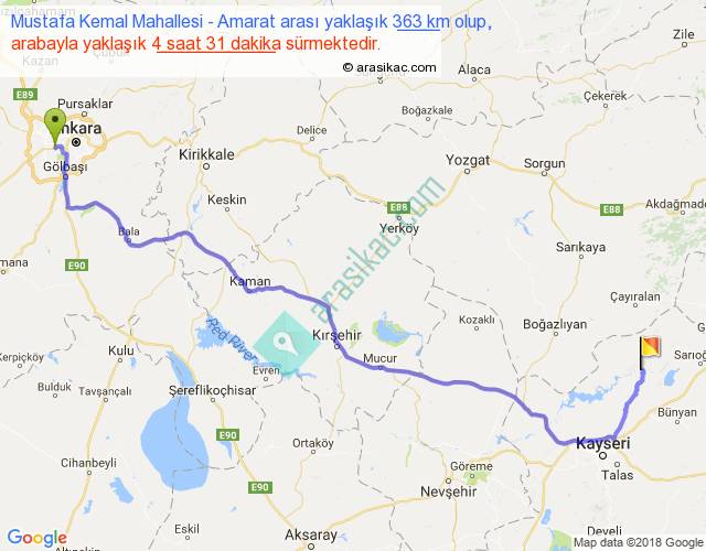 Mustafa Kemal Mahallesi - Amarat arası yaklaşık olarak 90 km/h ile yukarıda belirtilen sürede olup, iki yerin kuş uçuşu uzaklığı (mesafesi) 267'dir. Eğer belirtilen yerler arasında uçak seferi var ise bu süre uçakla 24 dakika'ya kadar düşebilir. Yolculuk otobüsle 5 saat 52 dakika sürmektedir.