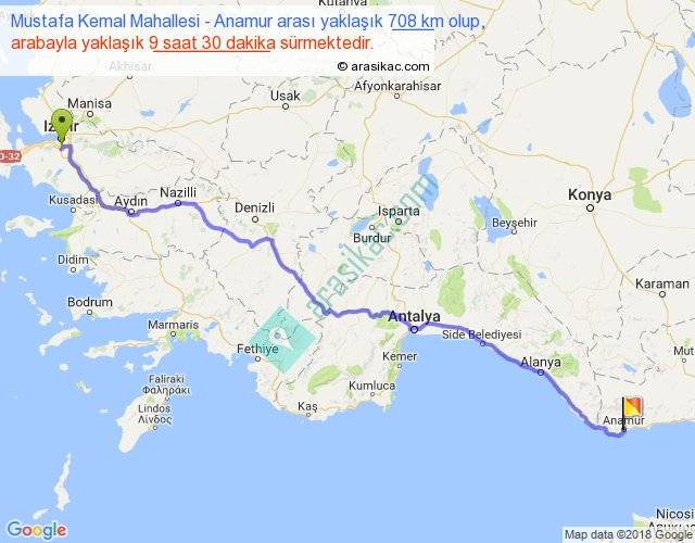 Mustafa Kemal Mahallesi - Anamur arası yaklaşık olarak 90 km/h ile yukarıda belirtilen sürede olup, iki yerin kuş uçuşu uzaklığı (mesafesi) 560'dir. Eğer belirtilen yerler arasında uçak seferi var ise bu süre uçakla 51 dakika'ya kadar düşebilir. Yolculuk otobüsle 12 saat 21 dakika sürmektedir.