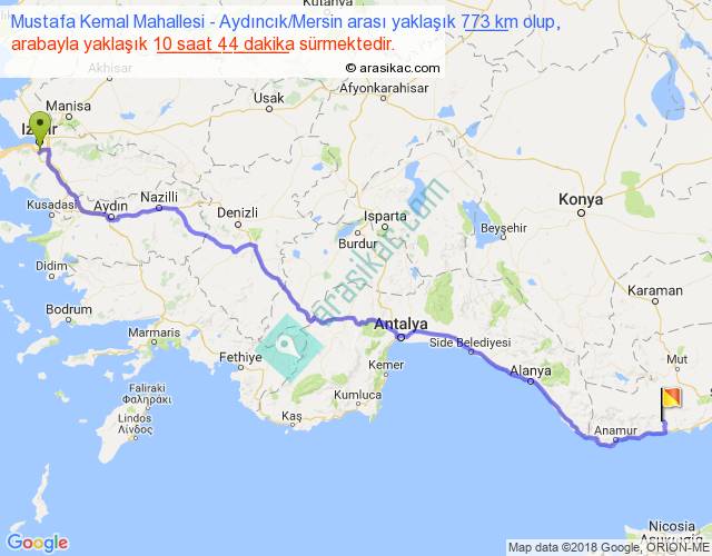 Mustafa Kemal Mahallesi - Aydıncık Mersin arası yaklaşık olarak 90 km/h ile yukarıda belirtilen sürede olup, iki yerin kuş uçuşu uzaklığı (mesafesi) 590'dir. Eğer belirtilen yerler arasında uçak seferi var ise bu süre uçakla 54 dakika'ya kadar düşebilir. Yolculuk otobüsle 13 saat 57 dakika sürmektedir.