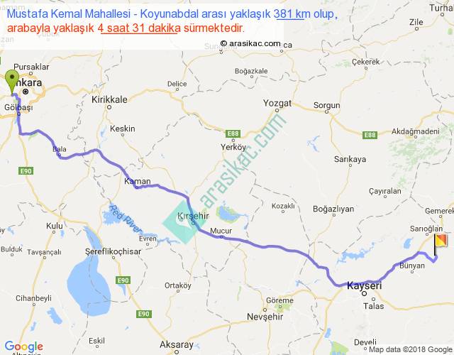 Mustafa Kemal Mahallesi - Koyunabdal arası yaklaşık olarak 90 km/h ile yukarıda belirtilen sürede olup, iki yerin kuş uçuşu uzaklığı (mesafesi) 299'dir. Eğer belirtilen yerler arasında uçak seferi var ise bu süre uçakla 27 dakika'ya kadar düşebilir. Yolculuk otobüsle 5 saat 52 dakika sürmektedir.