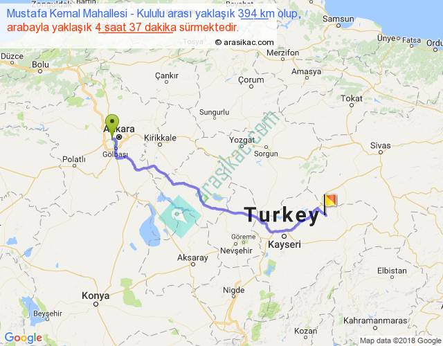 Mustafa Kemal Mahallesi - Kululu arası yaklaşık olarak 90 km/h ile yukarıda belirtilen sürede olup, iki yerin kuş uçuşu uzaklığı (mesafesi) 307'dir. Eğer belirtilen yerler arasında uçak seferi var ise bu süre uçakla 28 dakika'ya kadar düşebilir. Yolculuk otobüsle 6 saat 0 dakika sürmektedir.