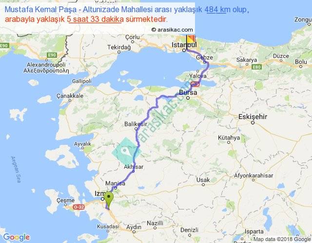 Mustafa Kemal Paşa - Altunizade Mahallesi arası yaklaşık olarak 90 km/h ile yukarıda belirtilen sürede olup, iki yerin kuş uçuşu uzaklığı (mesafesi) 342'dir. Eğer belirtilen yerler arasında uçak seferi var ise bu süre uçakla 31 dakika'ya kadar düşebilir. Yolculuk otobüsle 7 saat 12 dakika sürmektedir.