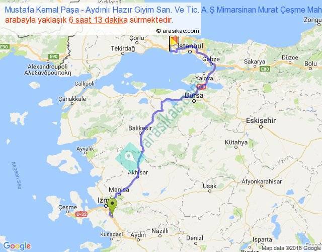Mustafa Kemal Paşa - Aydınlı Hazır Giyim San. Ve Tic. A.Ş Mimarsinan Murat Çeşme Mah. E-5 arası yaklaşık olarak 90 km/h ile yukarıda belirtilen sürede olup, iki yerin kuş uçuşu uzaklığı (mesafesi) 325'dir. Eğer belirtilen yerler arasında uçak seferi var ise bu süre uçakla 30 dakika'ya kadar düşebilir. Yolculuk otobüsle 8 saat 4 dakika sürmektedir.