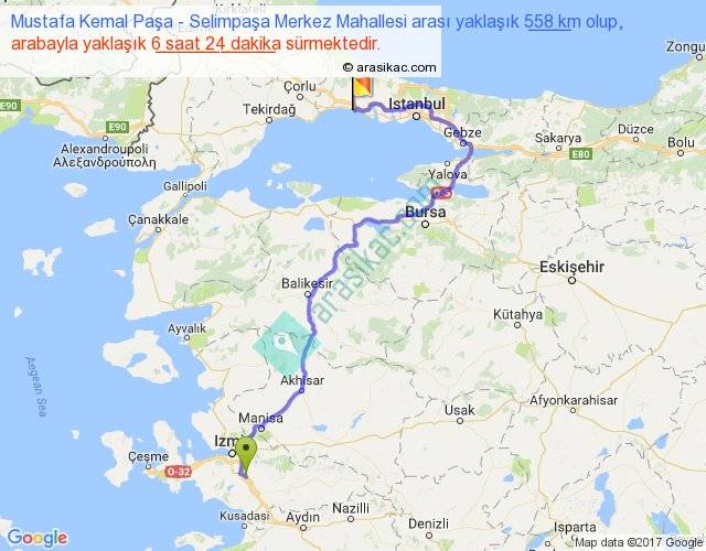 Mustafa Kemal Paşa - Selimpaşa Merkez Mahallesi arası yaklaşık olarak 90 km/h ile yukarıda belirtilen sürede olup, iki yerin kuş uçuşu uzaklığı (mesafesi) 324'dir. Eğer belirtilen yerler arasında uçak seferi var ise bu süre uçakla 29 dakika'ya kadar düşebilir. Yolculuk otobüsle 8 saat 19 dakika sürmektedir.