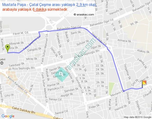 Mustafa Paşa - Çatal Çeşme arası yaklaşık olarak 90 km/h ile yukarıda belirtilen sürede olup, iki yerin kuş uçuşu uzaklığı (mesafesi) 2'dir. Yolculuk otobüsle 7 dakika sürmektedir.