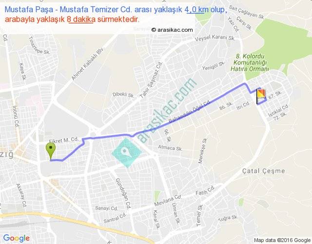Mustafa Paşa - Mustafa Temizer Cd. arası yaklaşık olarak 90 km/h ile yukarıda belirtilen sürede olup, iki yerin kuş uçuşu uzaklığı (mesafesi) 3'dir. Yolculuk otobüsle 10 dakika sürmektedir.