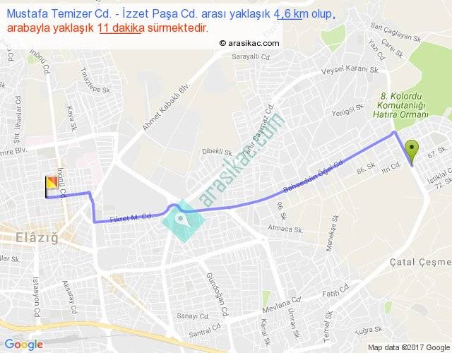 Mustafa Temizer Cd. - İzzet Paşa Cd. arası yaklaşık olarak 90 km/h ile yukarıda belirtilen sürede olup, iki yerin kuş uçuşu uzaklığı (mesafesi) 4'dir. Yolculuk otobüsle 14 dakika sürmektedir.