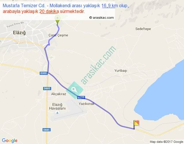 Mustafa Temizer Cd. - Mollakendi arası yaklaşık olarak 90 km/h ile yukarıda belirtilen sürede olup, iki yerin kuş uçuşu uzaklığı (mesafesi) 13'dir. Yolculuk otobüsle 26 dakika sürmektedir.