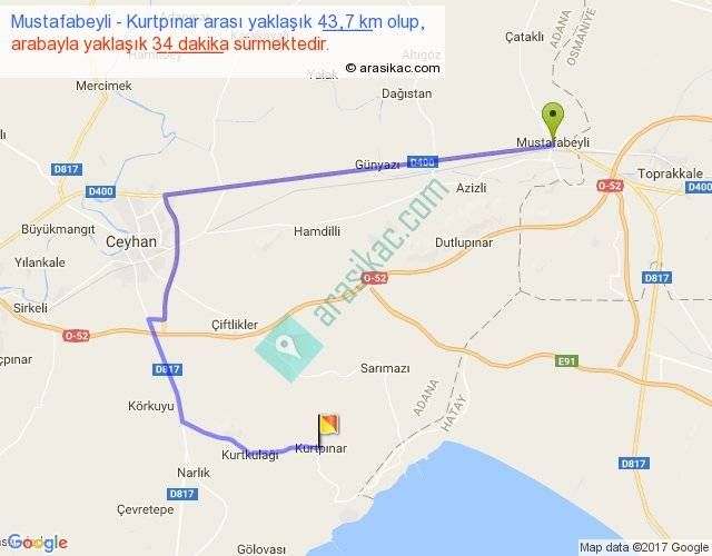 Mustafabeyli - Kurtpınar arası yaklaşık olarak 90 km/h ile yukarıda belirtilen sürede olup, iki yerin kuş uçuşu uzaklığı (mesafesi) 21'dir. Yolculuk otobüsle 44 dakika sürmektedir.