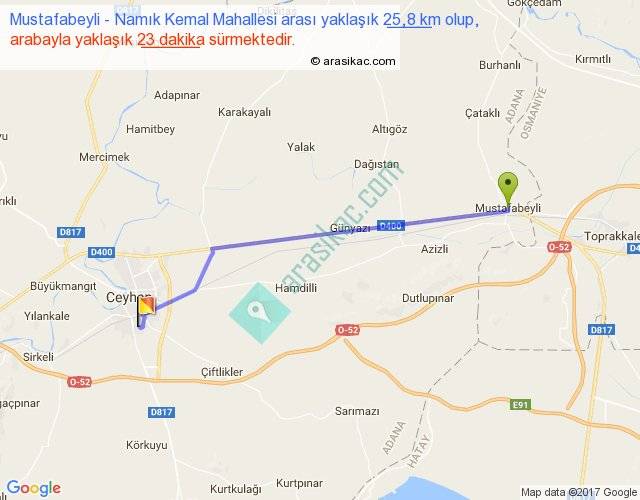 Mustafabeyli - Namık Kemal Mahallesi arası yaklaşık olarak 90 km/h ile yukarıda belirtilen sürede olup, iki yerin kuş uçuşu uzaklığı (mesafesi) 23'dir. Yolculuk otobüsle 29 dakika sürmektedir.