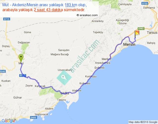Mut - Akdeniz Mersin arası yaklaşık olarak 90 km/h ile yukarıda belirtilen sürede olup, iki yerin kuş uçuşu uzaklığı (mesafesi) 115'dir. Yolculuk otobüsle 3 saat 31 dakika sürmektedir.