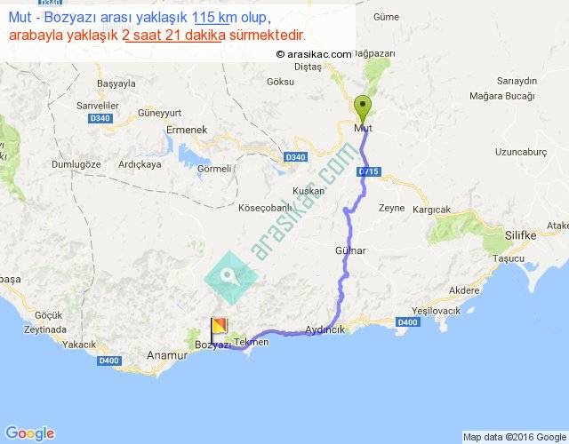 Mut - Bozyazı arası yaklaşık olarak 90 km/h ile yukarıda belirtilen sürede olup, iki yerin kuş uçuşu uzaklığı (mesafesi) 73'dir. Yolculuk otobüsle 3 saat 3 dakika sürmektedir.